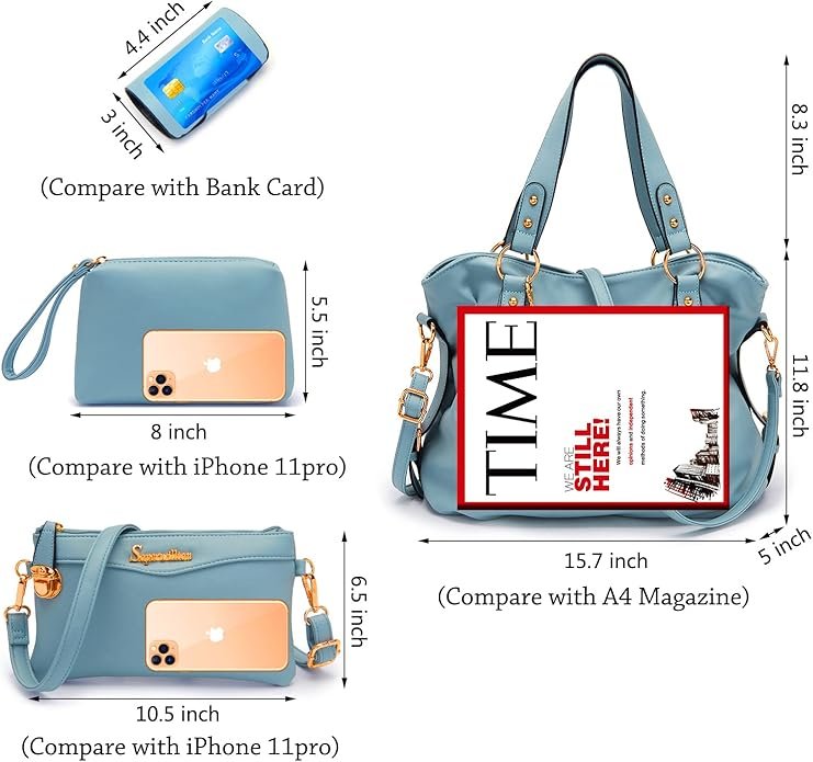 • PRACTICAL USE: 4pcs ladies handbag set can hold your A4 magazine, iPad, 13.3″ MacBook,umbrella,water bottle,makeups and other daily use.You can use them together or individually.Perfect gift for your girl friend,wife,daughter and mother.