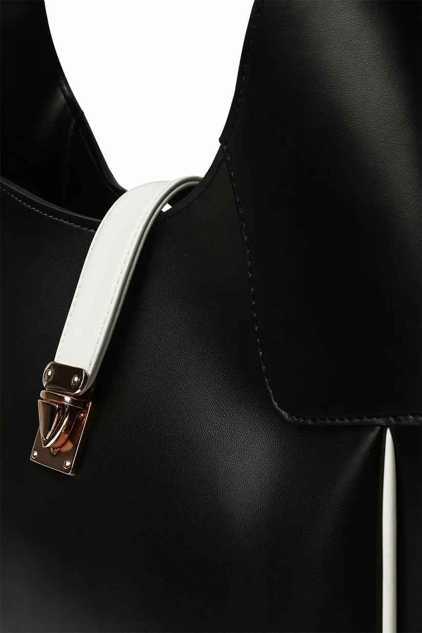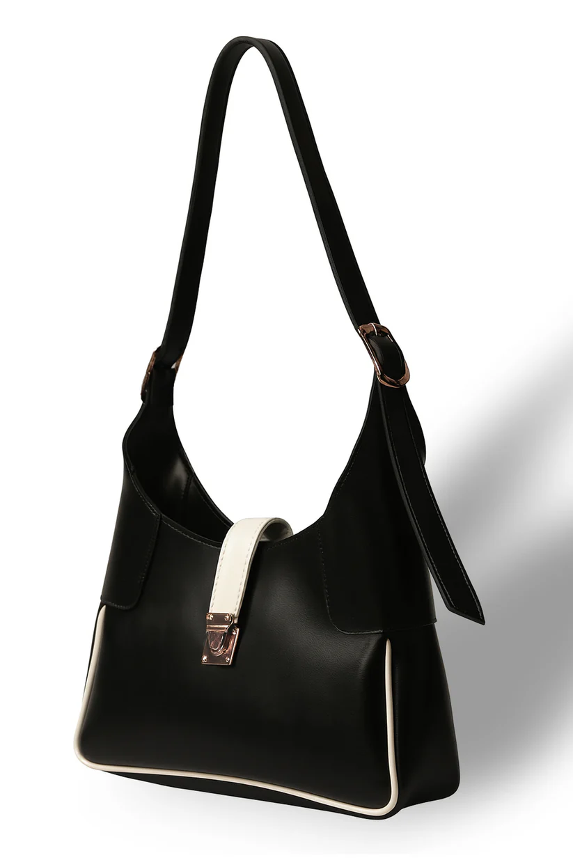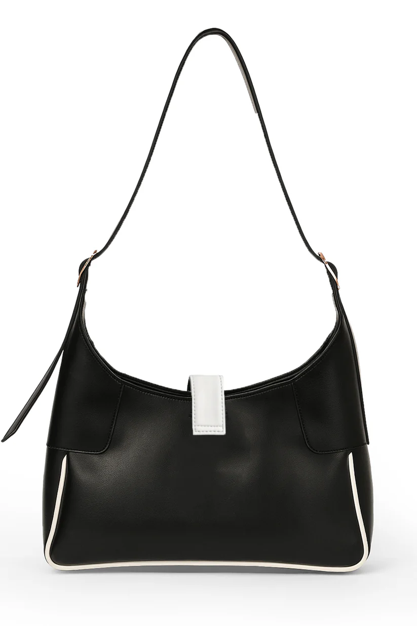 Elevate your daily fashion with the Dinohide Women’s Two-Tone Shoulder Handbag, a perfect blend of sophistication and functionality. Featuring a stylish black body with contrasting white trim and strap detail, this handbag offers a clean, modern look that stands out effortlessly.